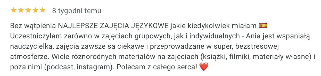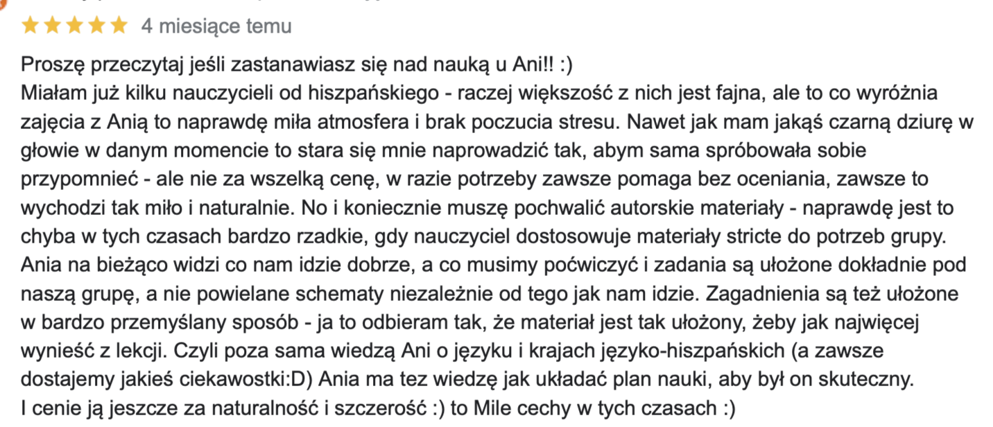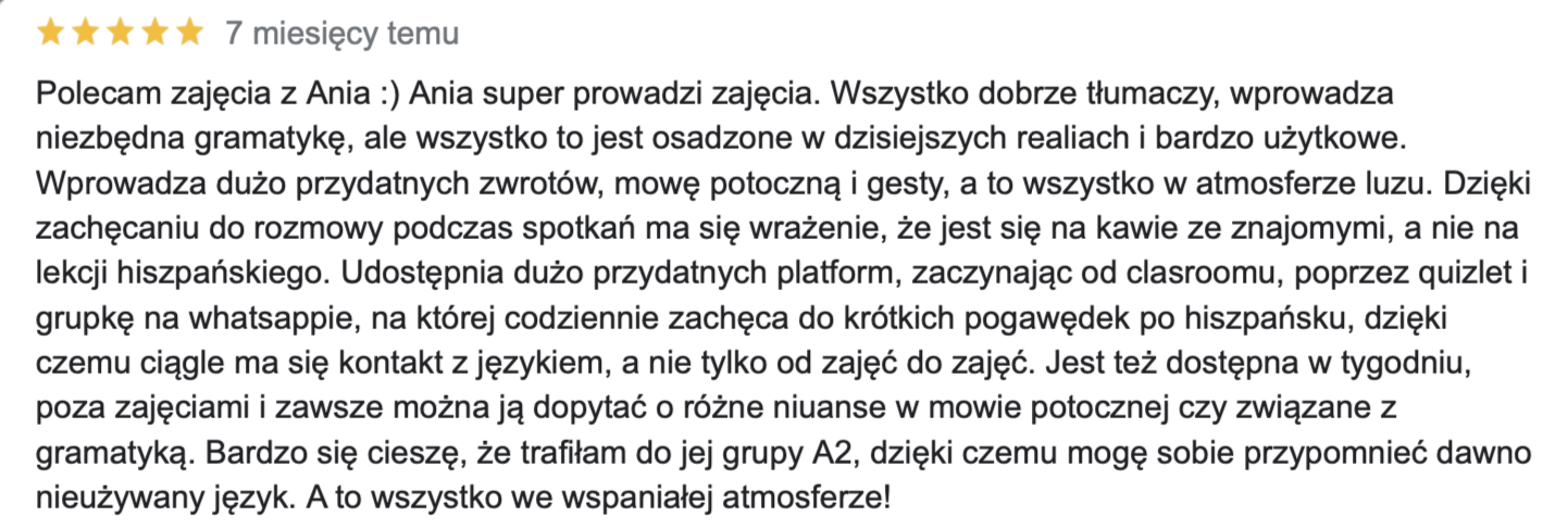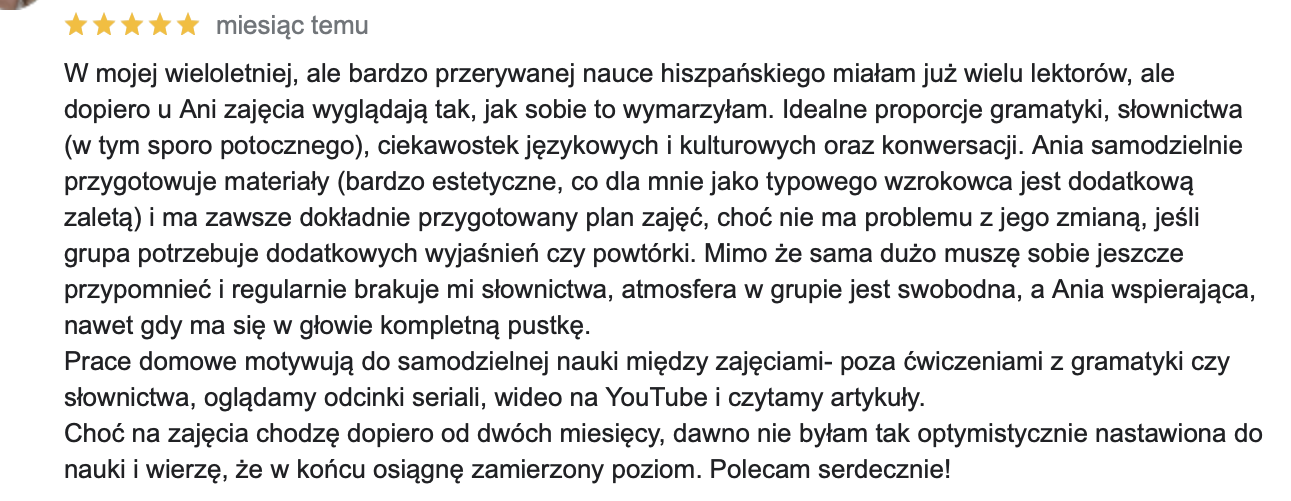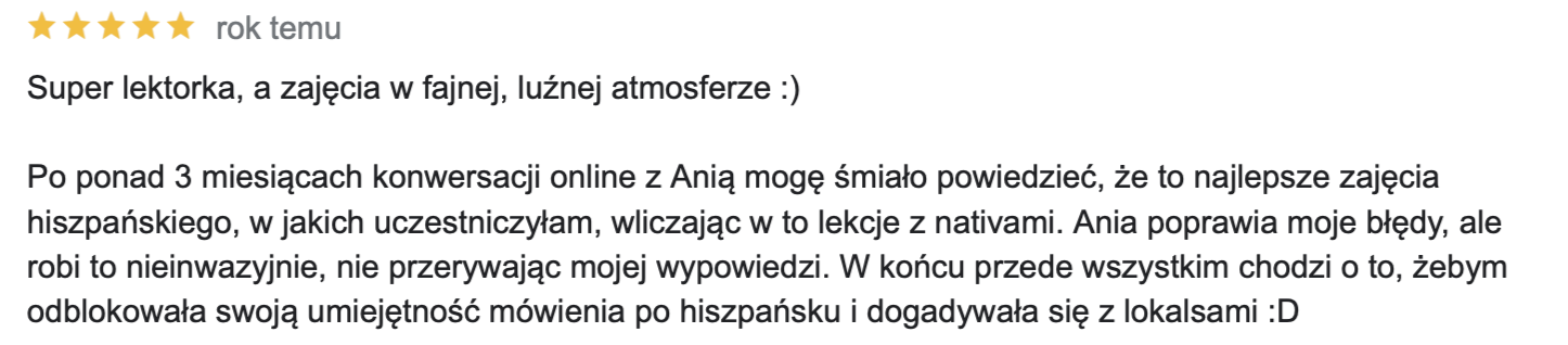 Od ponad 6 lat pomagam uczniom osiągnąć biegłość w hiszpańskim, oferując zajęcia w atmosferze przyjaznej i wolnej od stresu.