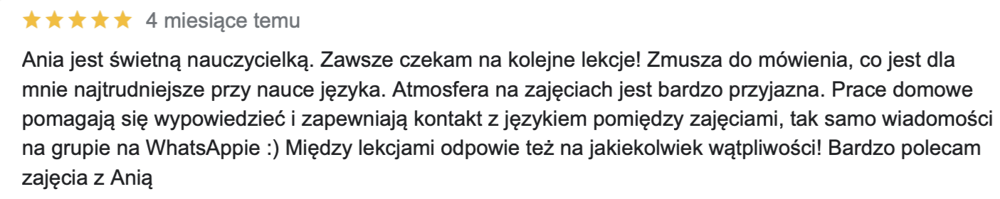 Moim celem jest odczarowanie nauki języka szczególnie dla dorosłych, którzy często wynoszą ze szkoły przykre wspomnienia, stres czy przekonanie, że „języki nie są dla nich”. Pokazuję, że nauka może być przyjemna, lekka i skuteczna – bez presji, za to z dużą dawką humoru, autentycznych rozmów i wspólnego odkrywania języka.